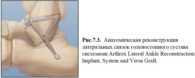 Описана анатомическая реконструкция латеральных связок голеностопного сустава с использованием системы имплантатов Arthrex Lateral Ankle Reconstruction Implant System и Versa Graft [Tourne Y.et al.,2012; Glazebrook M. et al.,2016; Huang B.et al., 2016; Mackay G.M. et al., 2016]. Фиксирующие сухожилие графты проходит через туннели в дистальном отделе малоберцовой кости, таранной кости и пяточной кости и обеспечивает анатомическую реконструкцию передней таранно-малоберцовой и пяточно-малоберцовой связок с простым их натяжением и жесткой фиксацией (рис.7.3 ).