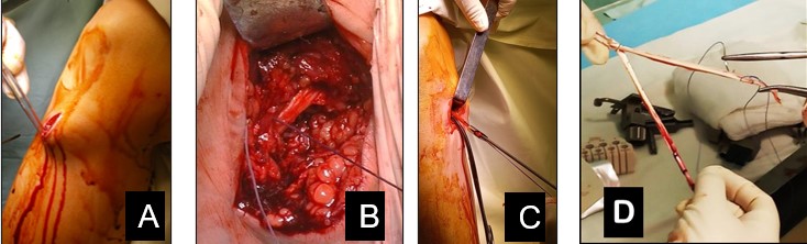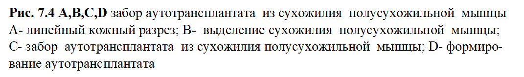 После трехкратной обработки операционного поля, нанесена хирургическая инцизионная пленка, сделан линейный кожный разрез 3 см, отступя от края бугристости большеберцовой кости кнутри на 1-2 см. (рис.A). После рассечения подлежащих мягких тканей и отделения их от фасции портняжной мышцы выявлено сухожилие полусухожильной мышцы. Фасция портняжной мышцы отделена от места прикрепления к бугристости, а затем оттянута кверху и кнутри, таким образом чтобы визуализировать сухожилие (рис.B). Сухожилие полусухожильной мышцы выделено от дистального места прикрепления. Конец сухожилия прошит лавсаном. С помощью ножа-стриппера выполнен забор сухожилия длинной 18 см. и толщиной сложенного вдвое 6,5 мм. (рис.C). Размер забранного сухожилия полусухожильной мышцы позволят сформировать аутотрансплантат удовлетворительной длины для данного пациента толщины и длины (рис.D). Фасция портняжной мышцы ушита. Послойное ушивание раны. Швы на кожу. Асептическая повязка.