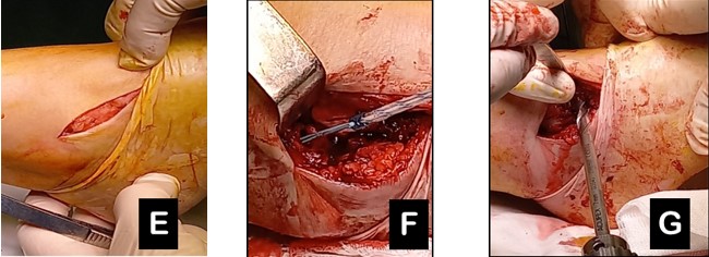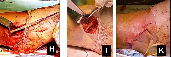 E- линейный кожный разрез; F- формированы туннеля в малоберцовой кости; G- формированы туннеля в таранной кости; H- проведение аутотрансплантата из сухожилия полусухожильной мышцы в малоберцовой кости; I- проведение аутотрансплантата из сухожилия полусухожильной мышцы в таранной кости и его фиксация; K-вид послеоперационной раны