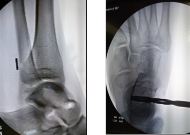 Выполняется линейный кожный разрез 4,5 см, отступая от переднего края латеральной лодыжки в направлении головки таранной кости (рис.E ) После рассечения подлежащих мягких тканей выполняется ревизия голеностопного сустава. При помощи специальный направителей сформированы малоберцовый туннель (рис. F) и туннель в таранной кости (рис.G ), диаметр которых соответствует диаметру трансплантата. Выполнена реконструкция передней таранно-малоберцовой связки правого голеностопного сустава: фиксация в малоберцовой кости пуговицей, фиксация в таранной кости интерферентным винтовым фиксатором 7-30мм. (рис.I ). Гемостаз по ходу операции. Рана обработана растворами ансисептиков. Послойное ушивание раны. Швы на кожу (рис. K) Асептическая повязка. Эластическая компрессия конечности. Ортезная иммобилизация.